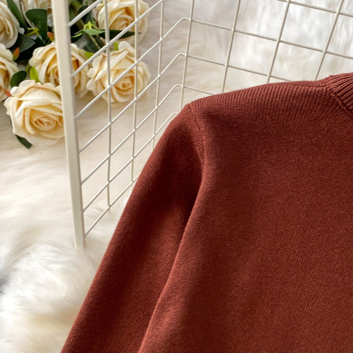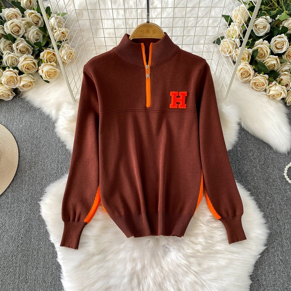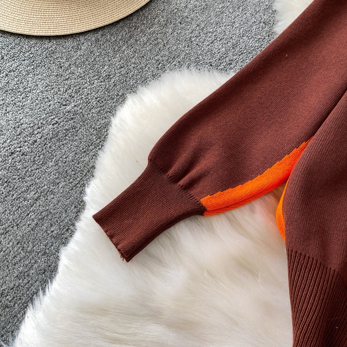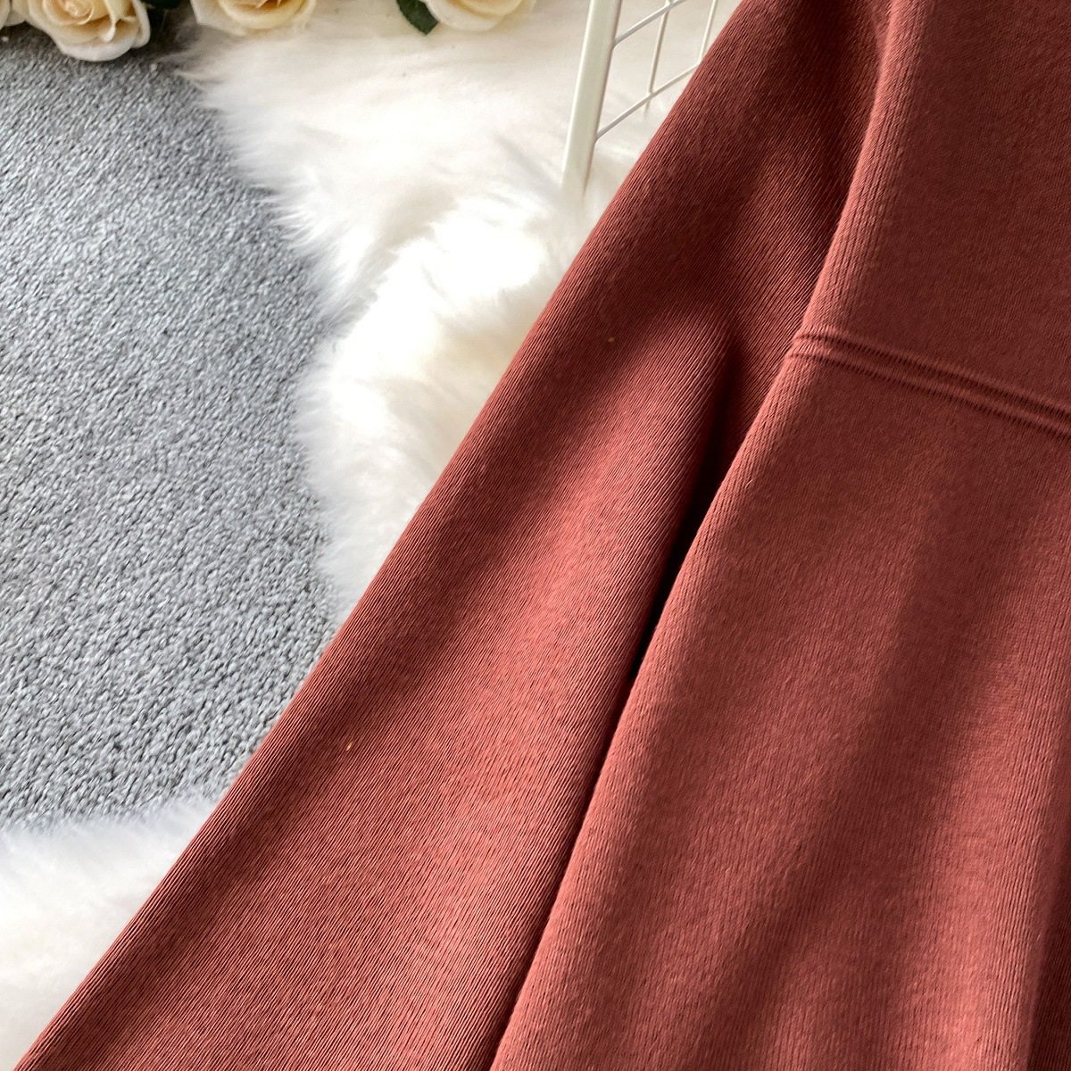 Slimming outfit with zippered half turtleneck long-sleeved knitted sweatshirt + contrasting color high-waisted mid-length skirt suit