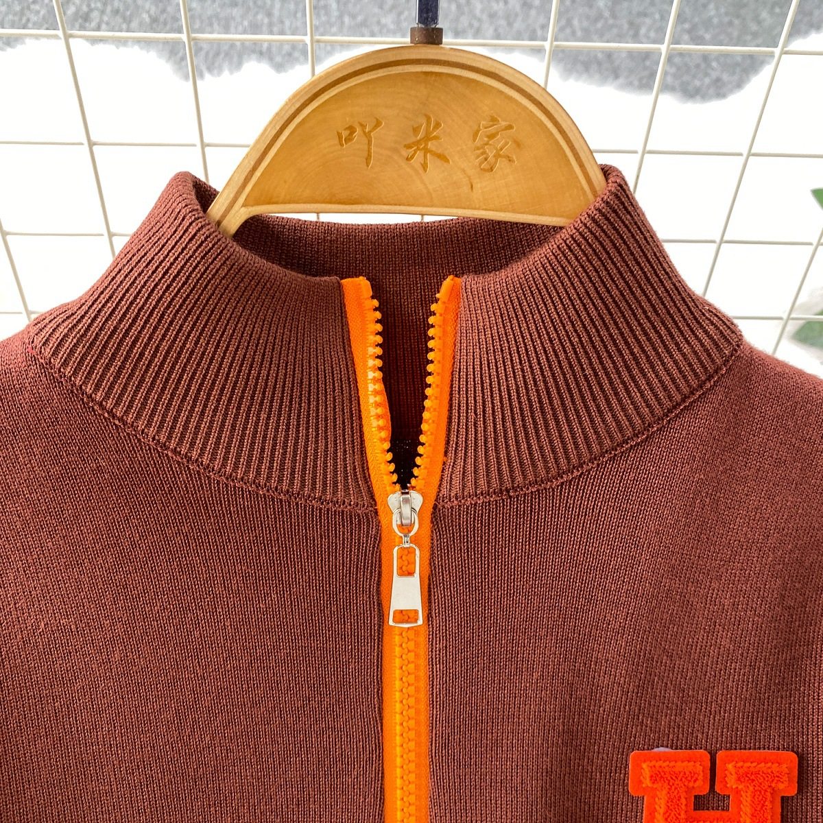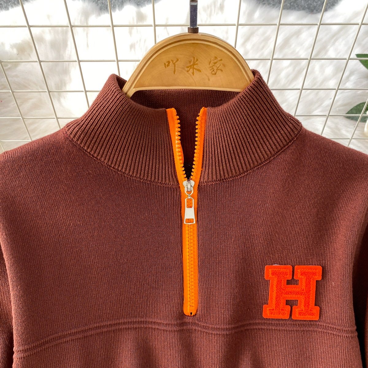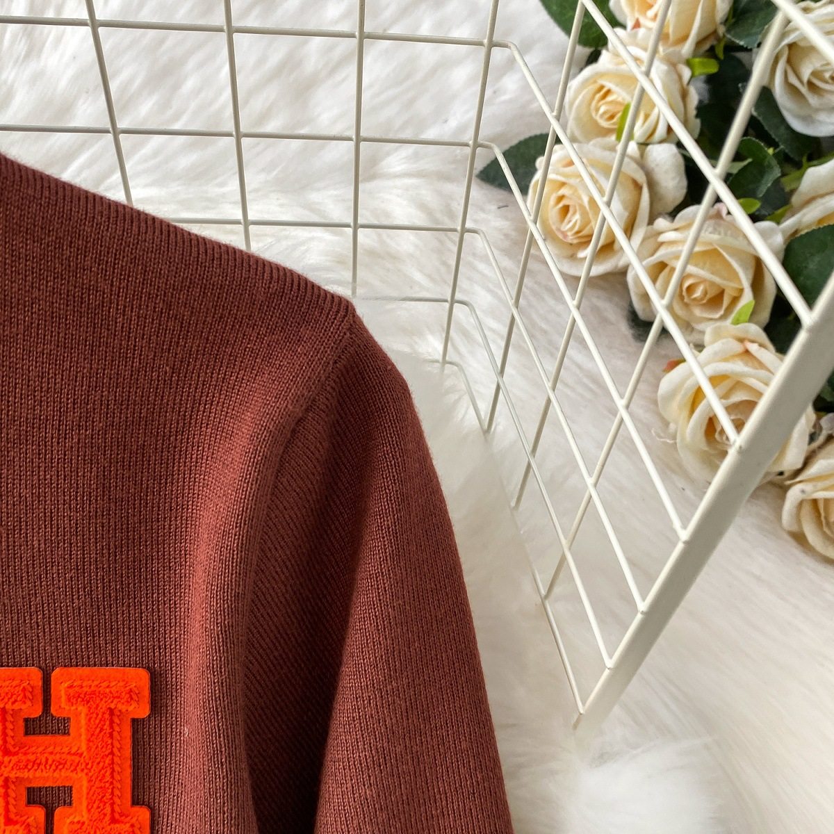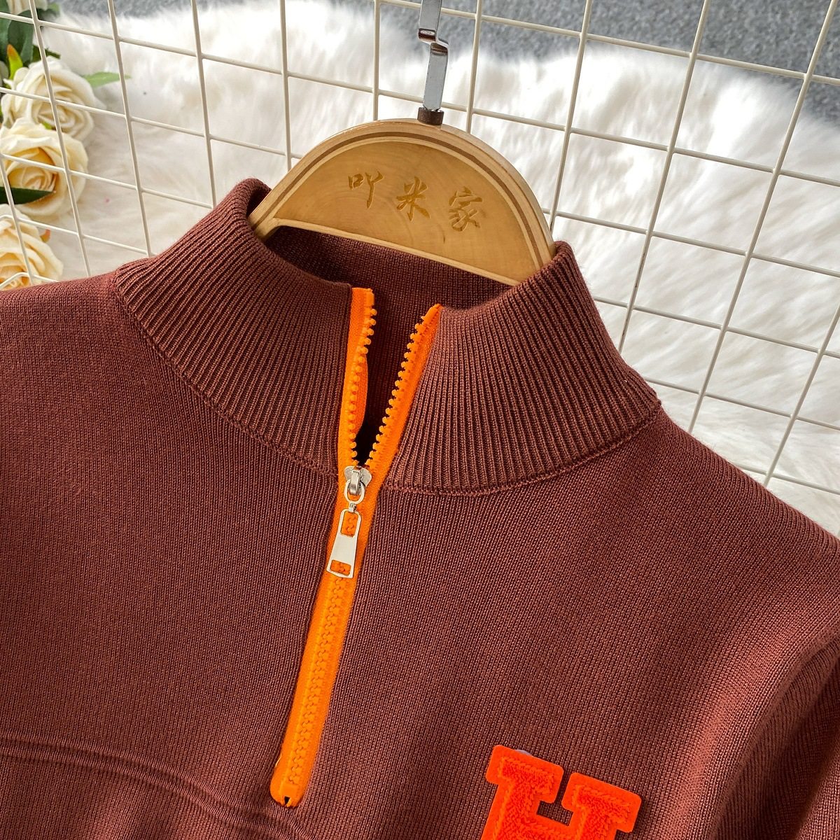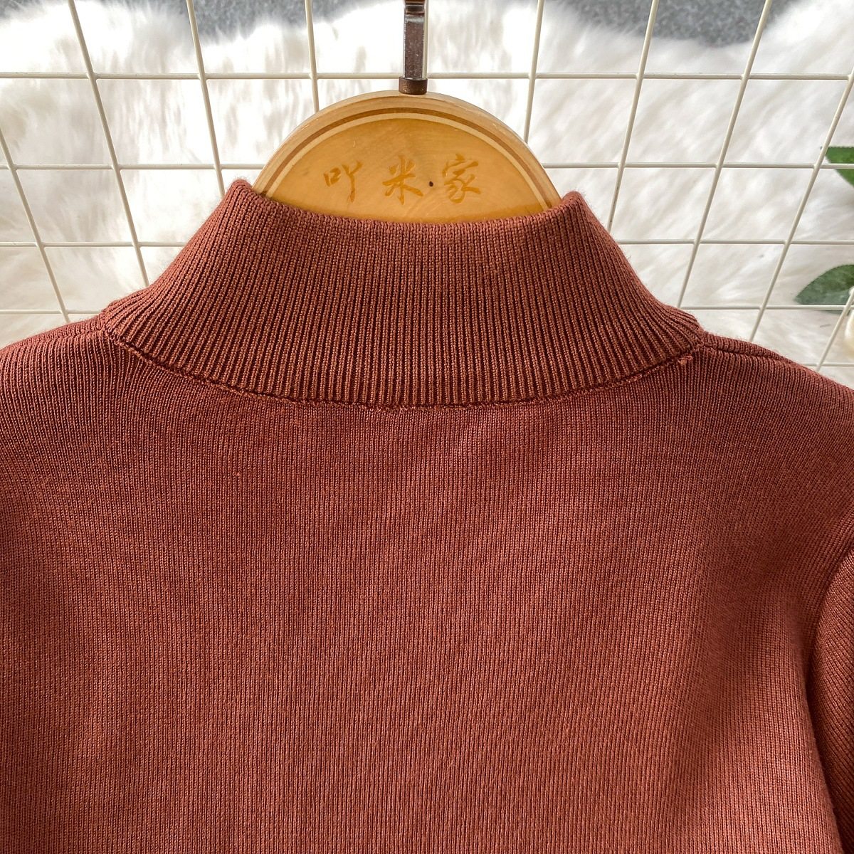 Slimming outfit with zippered half turtleneck long-sleeved knitted sweatshirt + contrasting color high-waisted mid-length skirt suit