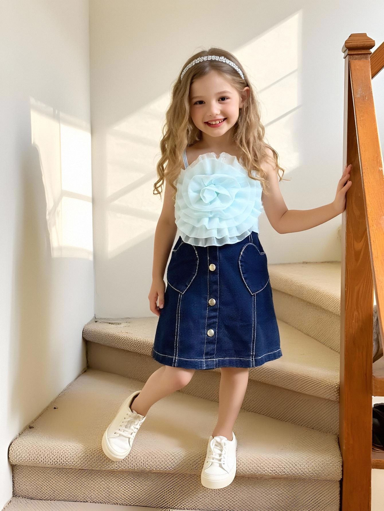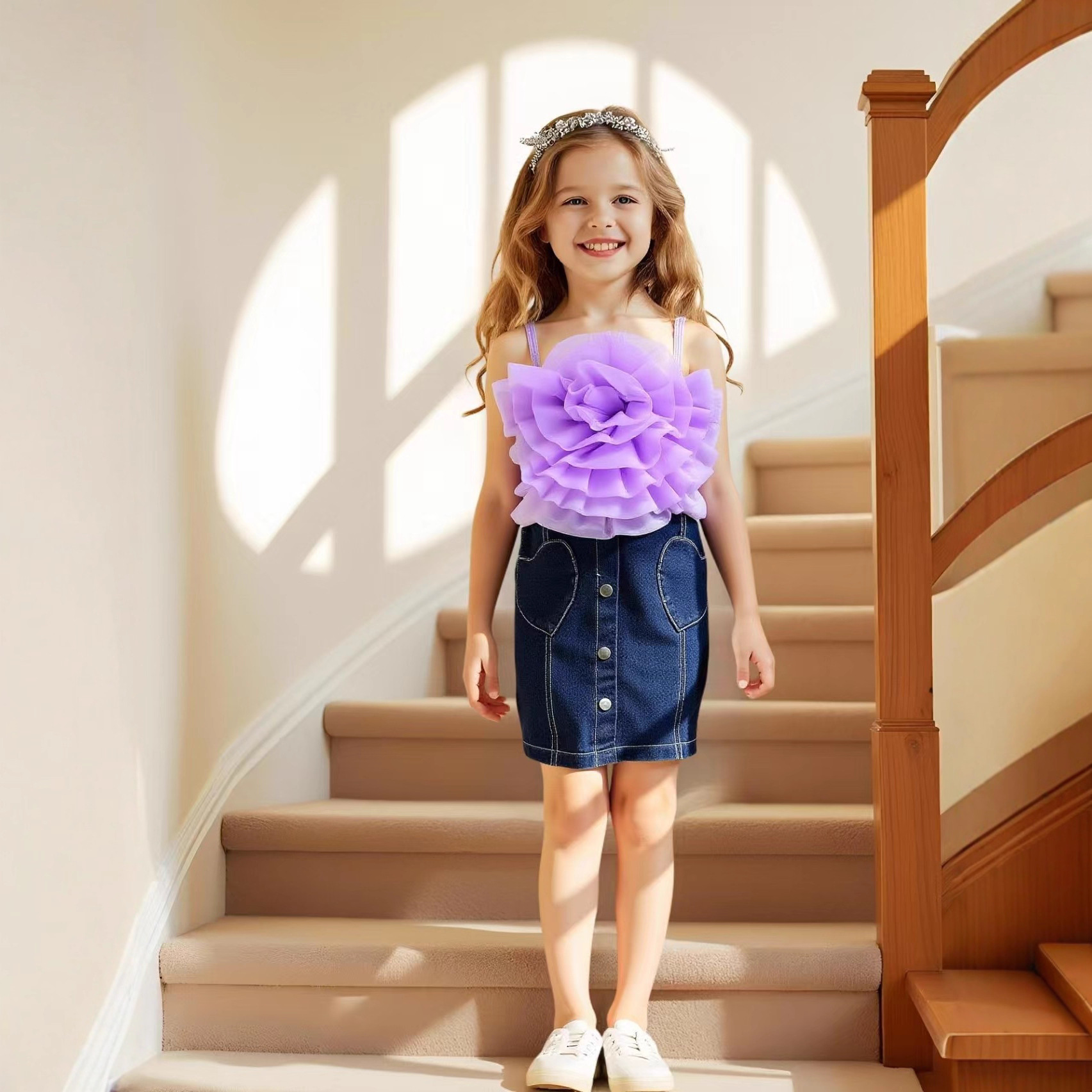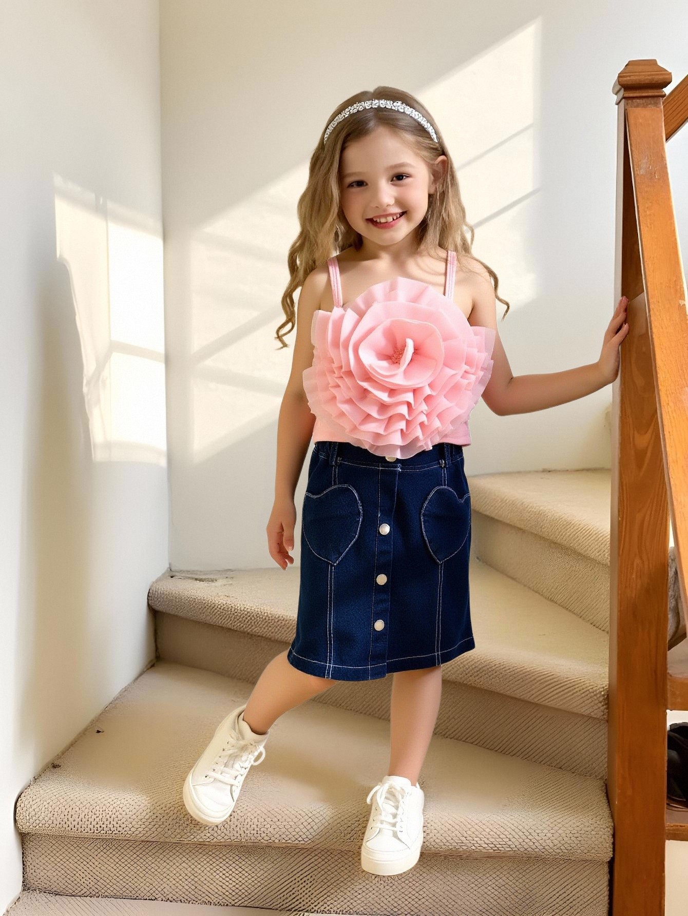 (FREE AIR SHIPPING) Three-Dimensional Floral Camisole Top and Denim Skirt Set High-Waisted Single-Breasted Topstitched Short Denim Skirt