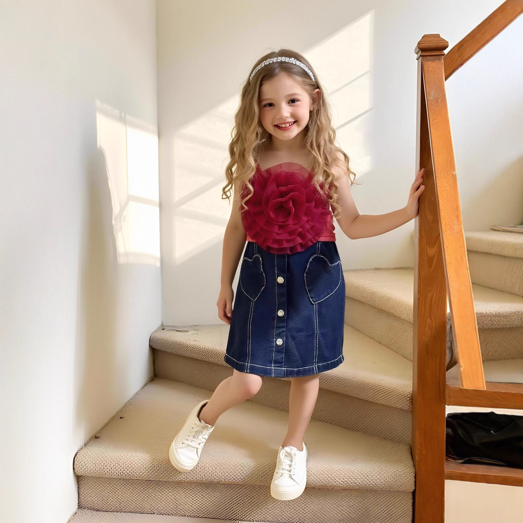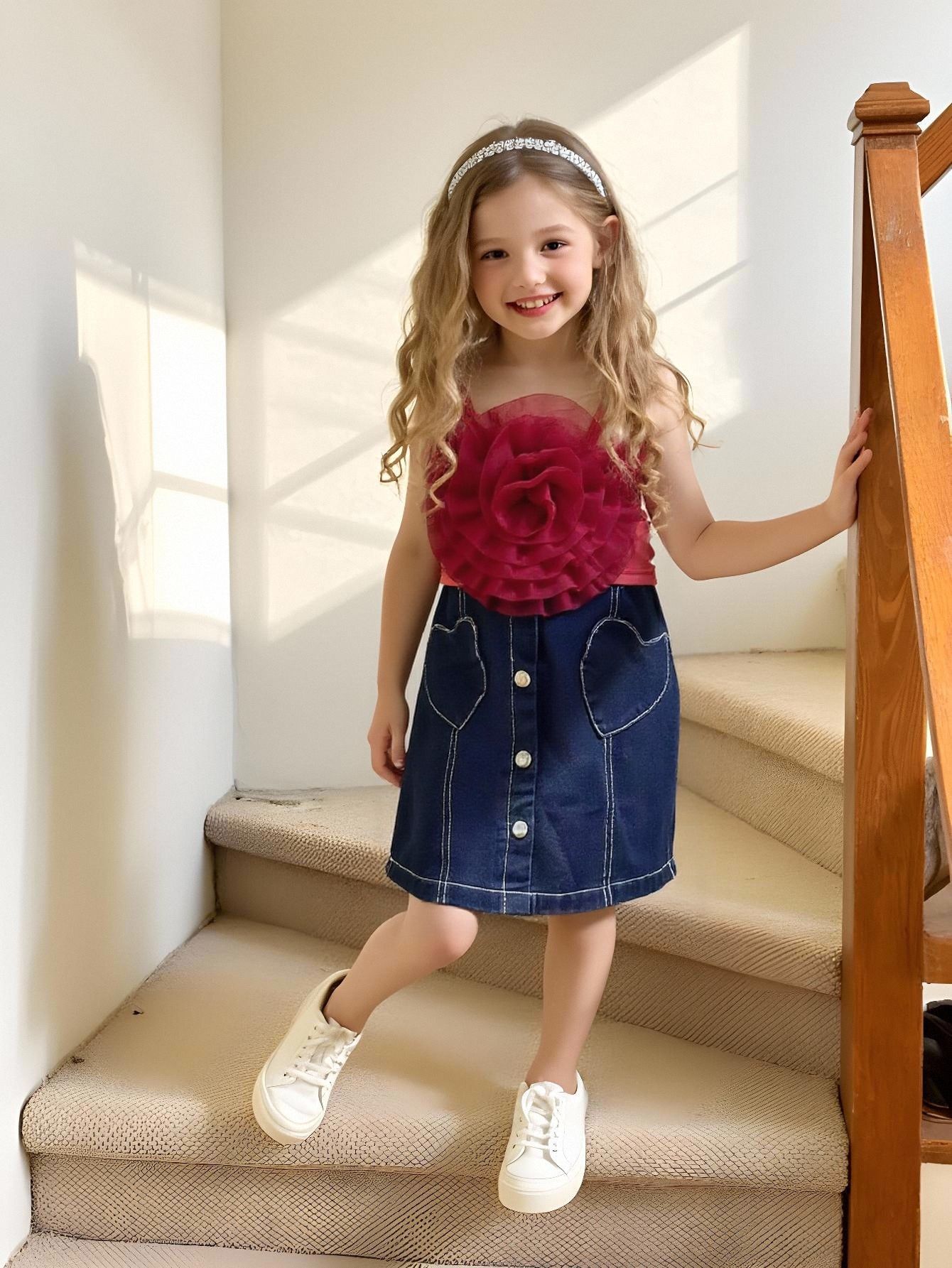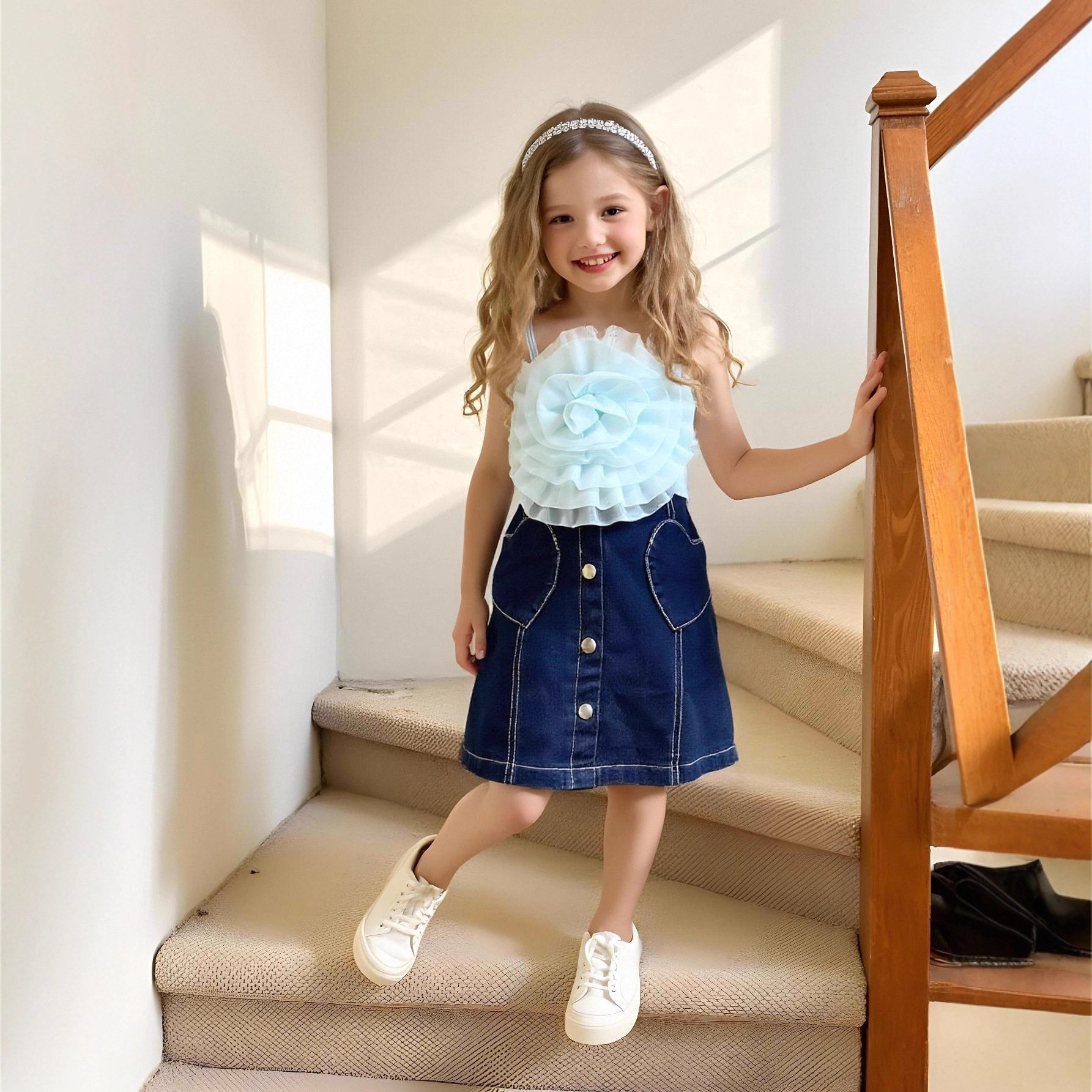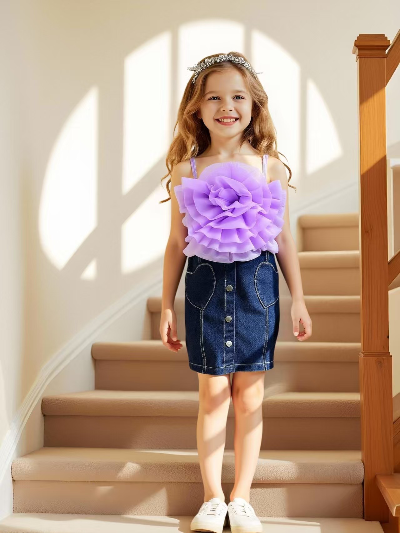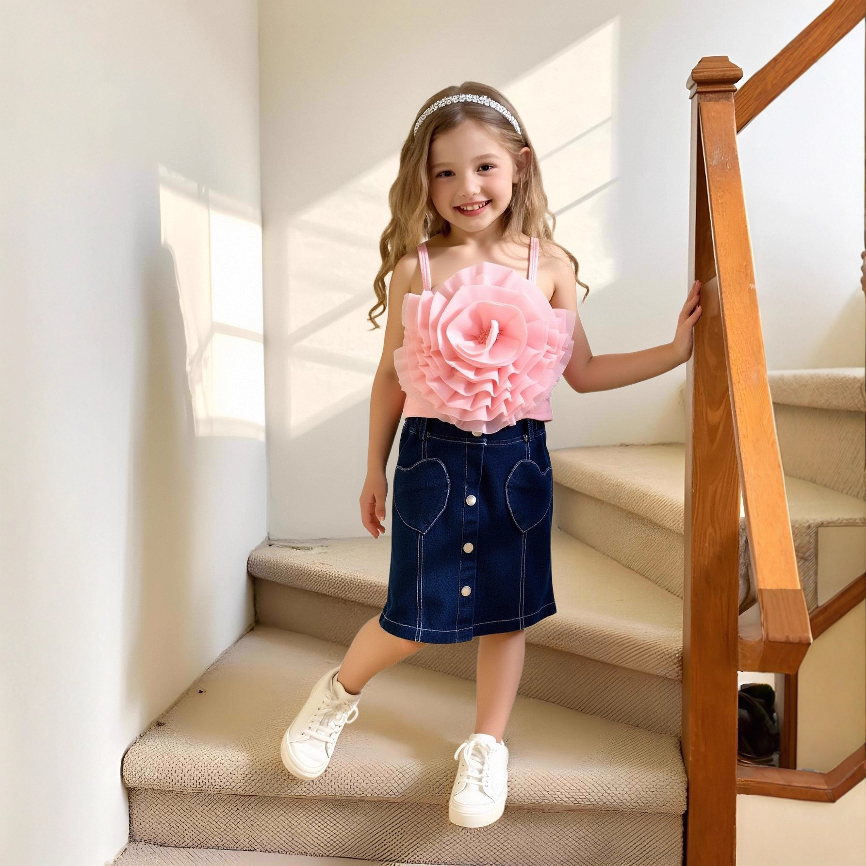 Three-Dimensional Floral Camisole Top and Denim Skirt Set High-Waisted Single-Breasted Topstitched Short Denim Skirt