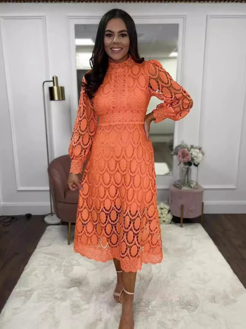 Women's sexy hollow long-sleeved stand-up collar large hem lace dress